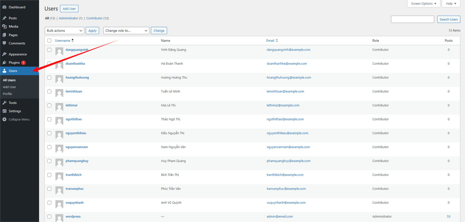 - Trong menu bên trái, chọn Thành viên (Users) > Tất cả người dùng (All Users).